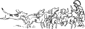 Однажды Дельфина и Маринетта возвращались на ферму с покупками для родителей. До дома оставалось пройти совсем немного. В корзинке у них лежали три куска мыла, сахарная голова, телячьи потроха и на пятнадцать су гвоздики. Девочки раскачивали корзину, каждая за свою ручку, и пели веселую песенку. Едва они дошли до припева — «тра-ля-ля, тра-ля-ля-ля», — как вдруг из-за поворота выскочил большой кудлатый пес. Он бежал, не разбирая дороги, вид у него был грозный: пасть оскалена, клыки торчат, язык свисает до самой земли. Вдруг пес резко взмахнул хвостом и рванулся вбок, да так неуклюже, что налетел на дерево у обочины. От неожиданности он попятился и сердито зарычал. Девочки похолодели от страха и прижались друг к другу, чуть не раздавив корзинку.