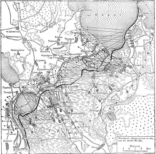 В феврале 1916 г. на французском фронте германцы начали атаку на Верден, что требовало от русских оказания помощи французам, как это было обусловлено в декабре 1915 г. на конференции в Шантильи. В русской ставке 24–25 февраля 1916 г. состоялось совещание главнокомандующих фронтами для выработки плана наступательных операций. Верховное русское командование в целях отвлечения на себя германских сил с французского фронта решило провести наступательную операцию в широких размерах левым флангом Северного фронта и правым флангом Западного в районе г. Двинска, оз. Нароч, оз. Вишневское (схемы 16 и 19). Главной операции должны были содействовать второстепенные операции Северного фронта со стороны Якобштадта на Поневеж и Западного фронта со стороны Сморгони[121] на Вильно. Оперативное направление русского наступления не только прикрывало пути на Петроград и на Москву, но при успехе прорыва германского фронта удачное наступление от Двинска, оз. Нароч на Ковно могло отрезать виленскую группу немцев от переправ через р. Неман, а концентрическим ударом по сходящимся направлениям на Поневеж, Свенцяны, Вилькомир (на схеме 16 показан под новым названием — Укмердже) создавалась серьезная угроза сообщениям противника: мог быть опрокинут весь северный участок германского фронта в России.