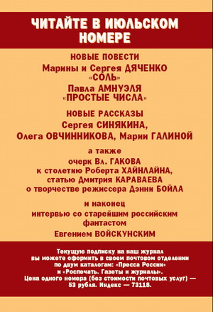 21 апреля в Центральном доме литераторов (Москва) отметили 85-летие Евгения Войскунского, известного писателя-фантаста. Среди присутствующих были и прозаики старшего поколения, и представители «четвертой волны», ма-леевцы, для которых Евгений Львович остается другом и наставником, и творческая молодежь. Юбилей Евгения Войскунского совпал с презентацией его новой книги «Ру-мянцевский сквер» о драматических судьбах бывших морских пехотинцев Балтфлота. Незадолго до юбилея писатель дал интервью для журнала «Если», которое будет опубликовано в следующем номере. Интернет-телевидение и интернет-радио — относительно новые формы масс-медиа. Тем не менее здесь все больше внимания обращают на фантастику. Так, канал «Живое ТВ» (In memoriam