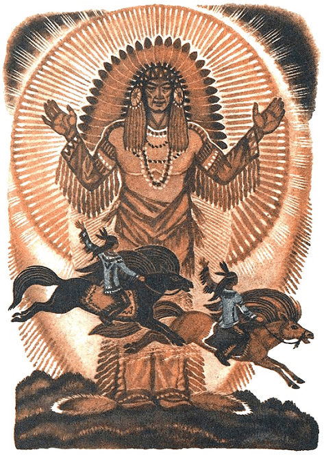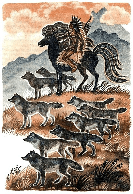Он задумчиво курил трубку-калюти, вылепленную из священной красной глины, и смотрел на расстилавшуюся перед ним прерию. Среди душистых степей паслись стада бородатых горбатых бизонов, а поодаль, в высокой траве, лежали серые волки, подстерегавшие одиноких молодых и неопытных коров.