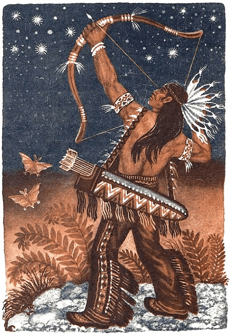 Череп медведя раскололся, как слабый лёд от напора плывущего каноэ. Вот так был убит большой горный медведь, гроза окрестных лесов, гроза людей. — Слава Мэджекивису! — кричали воины, кричали старики, когда вождь возвратился со священной повязкой Вампумом из страны Вабассо — белого кролика. Радовалось племя, и ликовали соседние общины. В честь Мэджекивиса танцевали и пели всю ночь и весь день, а сам старый вождь должен был несколько раз описывать, как погиб медведь. За этот славный подвиг он был избран людьми своего племени отцом всех ветров. Теперь он стал жить там, куда тропинкой заходящего солнца давно ушли умершие вожди, которые передали ему свою мудрость и давали советы. Поэтому его уже больше не называли Мэджекивисом, а только Кабейуном — Западным Ветром. Другие ветры он раздал своим детям. Самому младшему, Унто Вебону, он подарил Восточный Ветер. Южный дал ленивому Шавондаэи, а Северный Ветер, суровый и жестокий, — ужасному Кабиноке. С той поры они изменили человеческий облик и как духи ветров стали жить в разных частях света, владычествуя там.