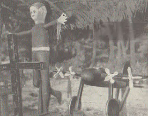 Деревянная символическая статуя Джона Фрума. Рядом — изображение самолета