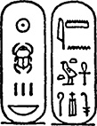 Два из имен фараона Тутмоса III. В левом картуше: Менхепер-Ра – «Крепка форма Ра». В правом картуше: Джхути-мес-нефер-хеперу – «Рожденный Тотом, прекрасный формами».
