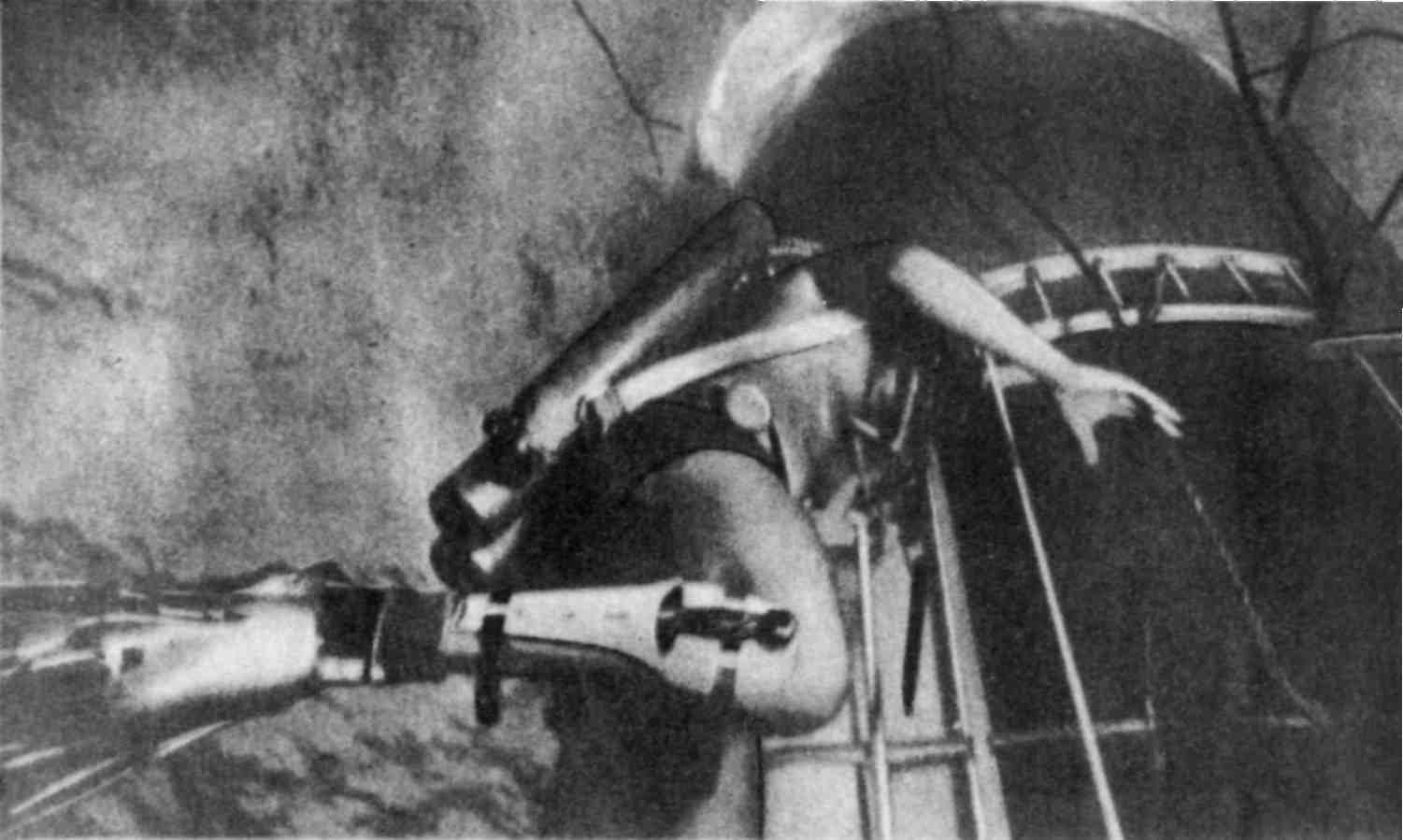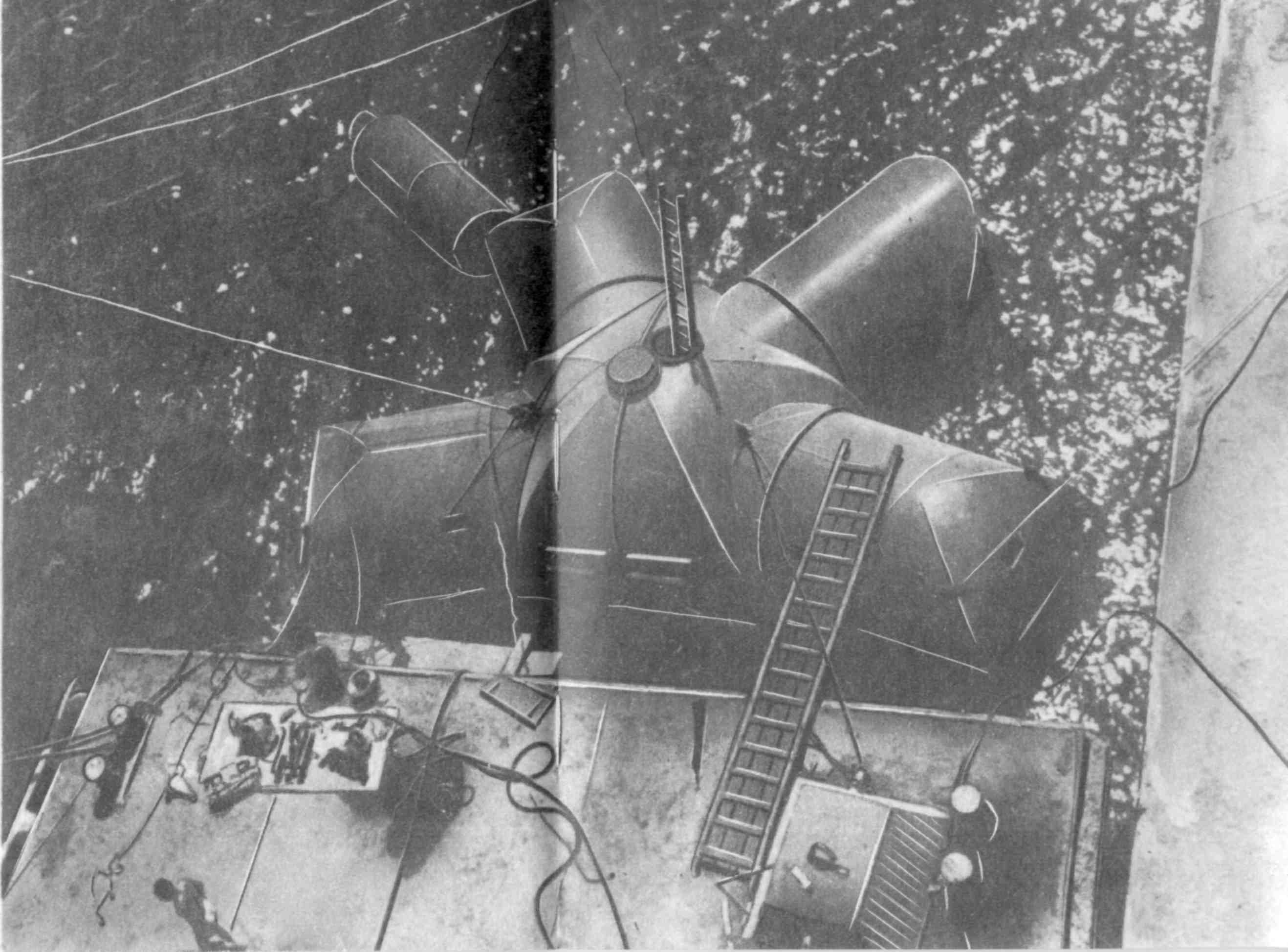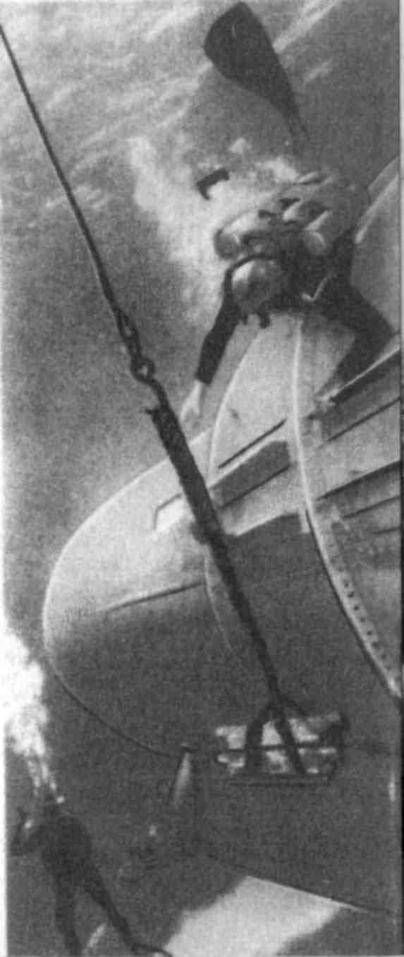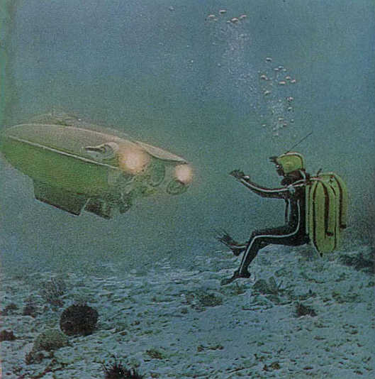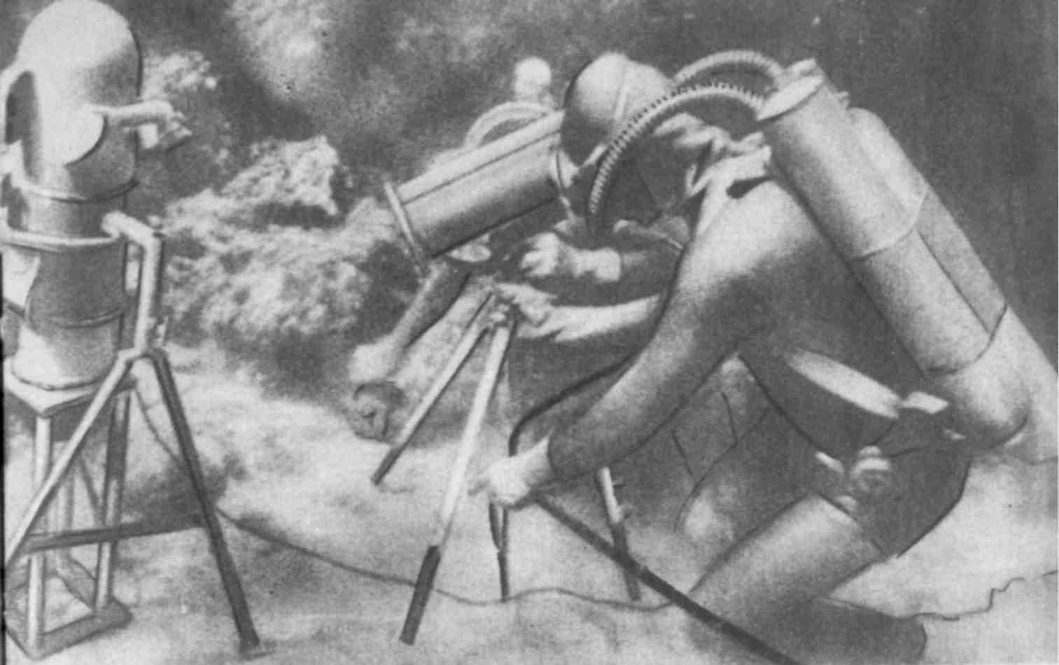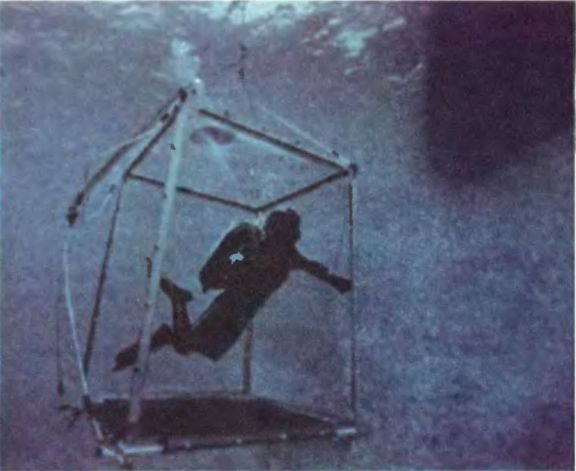 Над сквалоскопом показана одноместная клетка, приводимая в движение ногами подводного пловца. Это укрытие обеспечивает полную безопасность даже в окружении взбешенных акул. Обе клетки были изготовлены в наших мастерских на юге Франции под руководством капитана Брено