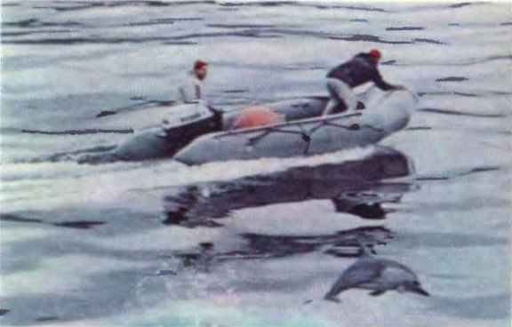 Рано утром мы с Симоной вышли из каюты; палуба медленно качалась в лад длинным, ленивым валам Индийского океана. Зевая и потягиваясь, мы стояли у левого борта, глядя на обожженный, голый берег Аравийского полуострова. "Калипсо" шла на восток вдоль Хадра-маута. В каюте зазвонил телефон. Говорил Саут, и голос его звучал очень тревожно: — Вы гложете подняться на мостик? Наш капитан нервно перебирал крупномасштабные карты. — Никаких рифов… — Что за рифы? — спросил я. — Огромный риф. Прямо по курсу, вся вода белая. Я метнулся в рулевую рубку и схватил бинокль. Вдоль горизонта впереди на несколько миль — пенный барьер! — Не может здесь, на самой трассе, быть риф, — сказал я. Риф почему-то колыхался… И только подойдя на полмили, мы поняли, в чем дело. Буруны оказались играющими дельфинами. Четверть века мы с Саутом провели на море, и никогда еще не видели такого огромного стада. Капитан позвонил в судовой колокол, вызывая всех на палубу. А дельфинье полчище развернулось, и прямо на нас устремился могучий вал, над которым ЖИВЫМИ брызгами взлетали извивающиеся черные тела. Это было какое-то массовое дельфинье помешательство. Дельфины — млекопитающие, они дышат легкими, и мы часто любовались их изящными высокими прыжками. Но сейчас они выскакивали из воды вертикально вверх, причудливо изгибаясь в воздухе. Соревнование в прыжках в высоту? Свадебные пляски? Или буйное ликование победителей в неведомой войне в глубинах? Мы забегали, заметались по трапам — скорее вооружиться фотоаппаратами, занять места на наблюдательном мостике и в подводкой обсерватории! Весь этот день курс "Калипсо" определяли дельфины, летучая фаланга, которая заняла всю ширь океана от края до края. Я попробовал измерить высоту прыжков. Дельфины взлетали над водой на двенадцать — пятнадцать футов. Падая, они изгибались так, точно состязались, кто шлепнется в воду в самой некрасивой позе. Интересно было определить их число. Одновременно над водой находилось до тысячи животных; средняя продолжительность прыжка была около трех секунд. Но на каждого дельфина в воздухе приходилось, наверное, не меньше девятнадцати под водой. Двадцать тысяч дельфинов образовали этот живой риф… Огромный, сверкающий на солнце гребень пены и летящих тел катился вдоль побережья Хадрамаута неведомо куда, движимый необузданным коллективным восторгом. Крича, как дети, мы спорили, чей дельфин прыгнул выше. Два десятка кинолюбителей соревновались, кому удастся заснять рекорд дельфиньих олимпийских игр. Из подводной кабины открывалось потрясающее зрелище. Вода была прозрачная, видимость — около ста футов, и все это пространство кишело быстрыми пловцами, которые легко поспевали за "Калипсо". Некоторые подходили вплотную к иллюминаторам поглядеть в упор на людей в "обсерватории". Наиболее энергичные тенями проносились вперед, пронизывая живую массу. Непрерывное движение перемешивало этот рой не только по горизонтали; снизу, из пучины, прямо вверх мчались дельфины, которые возле наших иллюминаторов включали "вторую космическую скорость" и с лета пробивали блестящий свод. Потом плюхались плашмя в воду, группировались и ныряли, оставляя в голубой толще белый след воздушных пузырьков, чтобы тут же с невидимых нам стартовых площадок начать новый полет к солнцу. Естественно, кто любовался этим карнавало