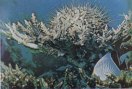 Морской еж похож на круглую дверную ручку, пси крытую иглами. Иглы подвижные, они могут вам причинить болезненный, хотя и не смертельный укол. Некоторые морские ежи действуют иглами как ногами, идя по дну, другие переступают маленькими ногами-трубочками. Под иглами кроется мясо, которое рыбы очень любят, — только бы знать, как до него добраться. Морской еж надежно защищен.
