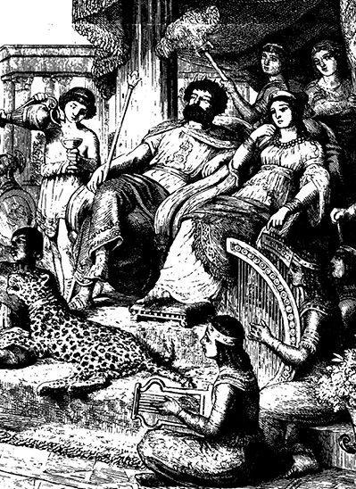 Літографія ХІХ століття в англійській Біблії. «Наповнимо себе благородним вином і пахощами, і нехай не пройде повз нас весняний цвіт життя. Заквітчаємося пуп’янками троянд, перш ніж вони зав’януть. Нехай ніхто з нас не позбавить себе участі в нашій утісі; всюди залишимо сліди веселощів» («Книга Мудрості»)