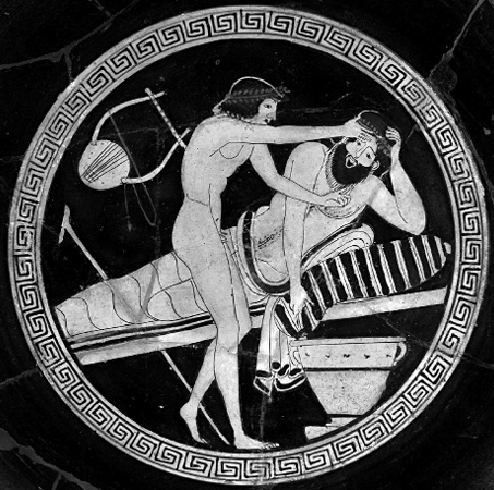 Афінські аристократи в VI столітті до н. е. почали запрошувати на свої свята й інших гостей, крім «політиків», які тільки те й робили, що обговорювали договори й спільні справи. Гості стали опановувати різні ролі. Незмінним гостем був «підлесник», який, аби «заплатити» за частування, підлещувався до хазяїна, якого називали «годувальником»335. На описаному Ксенофонтом бенкеті336 у двері хазяїна Каллія стукає Філіпп, який прагне розважити гостей, оскільки має «все, що потрібно, аби їсти чужий хліб». Філіпп уже на порозі заявляє, що такому блазню, як він, на його думку, «веселіше прийти на бенкет незапрошеним, аніж якби його запросили». Філіппа запрошують прилягти. Та Філіпп не спромігся розвеселити гостей і, засмучений цим, завершує трапезу: «Раніше мене кликали на обіди для того, щоб я розважав гостей, а тепер задля чого хто мене покличе? Мені легше було б стати безсмертним, аніж серйозним; запрошувати мене, очікуючи отримати запрошення у відповідь, теж ніхто не стане, тому що всі знають, що до мене додому приносити обід[40] зовсім не прийнято».