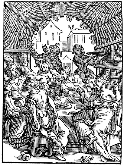 Весілля в Кані. Заборонені шлюби між ізраїльтянами і ханаанцями були темою ксилографії Крістофера фон Сихема, 1646 р. Подія виглядає дуже радісною