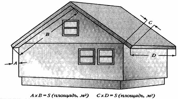 Рис. 10. Расчет площадей рядового сайдинга: а — по стенам; б — по треугольным фронтонам; в — по ломаным фронтонам; г — по слуховым и чердачным окнам