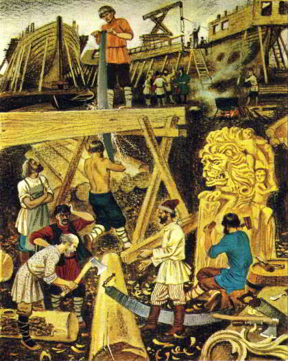 Нужно время. А весной морской караван должен выйти к Азову. Для строительства первой русской флотилии Пётр выбрал город Воронеж. Тут и река судоходная — Воронеж. И леса — дубовые, буковые, липовые, сосновые. А на небольшом острове против города издавна рубили и строгали грузовые лодки — струги. Каждый год на них перевозили хлебное жалованье донским казакам, охранявшим южные границы России. Вот почему в городе много мастеровых людей — плотников, смолокуров, канатчиков. В марте начали прибывать в Воронеж галеры из подмосковного села Преображенского. При каждой разобранной галере был капитан с командой. Лучших своих товарищей отрядил Пётр в морскую службу. — Первый поход славной флотилии! — глядел Пётр на унылую вереницу тяжелогружёных телег. — Развернёмся боевым строем на Синем море!