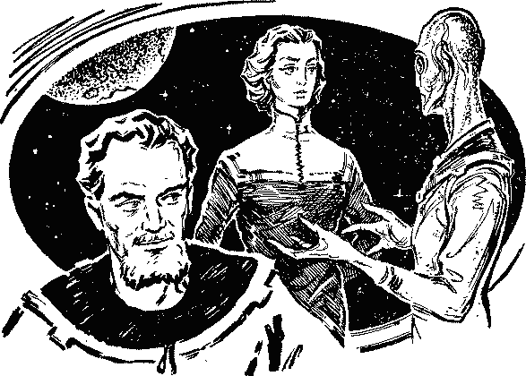 Вилена сама не помнила, как домчалась до дому в турбобиле, который, к ее удаче, стоял у парка звездного городка и был свободен. Всю дорогу из ее головы не выходило: «Звездолет!.. Разгон с земным ускорением!.. Торможение!.. Но это потом! Сначала — я!» «Я! Я! Я!» — торжествующе кричало все в ней. В дом она влетела как на крыльях. Бросилась бабушке на шею. Бабушка вытирала ей слезы и говорила: — С утра ждет тебя. Иди уж. — Кто ждет? — не поняла Вилена, сразу став строгой. — Кто же еще? Твой Арсений Романович, конечно. Вилена удовлетворенно вздохнула. «Ну вот! Оказывается, он сам пришел, а я… И все время сидел здесь. И ничего не знает!» — И Вилена решительно направилась в комнаты. Маленькая Авеноль важно занимала гостя, сидевшего подле рояля. Она старалась изо всех сил и говорила за двоих, не смущаясь односложными ответами Арсения. Увидев сестру, Авеноль шутливо сделала реверанс и со смехом убежала. Родителей дома не было. Не вернулись с работы. Юлий Сергеевич, очевидно, находился все еще в своем Кибернетическом центре, Анна Андреевна — художница по внутреннему устройству квартир — где-нибудь увлеченно отстаивала свой прославленный вкус. Арсений, поднявшись, стоял среди изысканно, с редким вкусом обставленной комнаты — огромный, неуклюжий, словно из другого мира, — и виновато смотрел на Вилену. — Почему же ты все-таки пришел? — вскинув острый подбородок, с радостным вызовом спросила она. — Ведь не хотел видеться до самого отлета? — Не смог, — опустив голову, сказал он. — Ну вот, теперь не смог. А тогда? — Хотел… уберечь. — И что же? — Косте первому признался. — Косте? И в чем же? Вилена, ликующая, счастливая, смотрела на Арсения, будто навсегда старалась запомнить каждую линию его громоздкой фигуры, склоненную голову, крупные черты лица, так похожие на мраморный памятник Вечному рейсу. Видя, что он что-то хочет сказать и не решается, она требовательно спросила: — Так в чем же признался… хоть Косте? — Что женюсь… перед самым отлетом, — через силу, даже побледнев лицом, выдавил из себя Арсений. — И что же этот Костя? — звенящим, уже почти смеющимся голосом допрашивала Вилена. — Предложил заменить… меня. — На звездолете, надеюсь! — с шутливым возмущением воскликнула Вилена. — Что же ты ответил? — В полете заменить сможет. Но вот сыном моего отца не станет. — И, помолчав, добавил: — Ратов должен лететь. Клятва была дана. — И что же Костя? Понял он это? — Еще как! Рассвирепел. — Конечно, на меня? — игриво спросила Вилена, привлекая к себе Арсения. Теперь рассмеялся и Арсений: — Назвал тебя «приемной бабушкой». Грозился непременно прийти с клюкой смотреть, как мы встретимся: бабушка с мужем-внучком. — Это меня не остановит, — весело тряхнула головой Вилена, потянулась губами к губам Арсения. На этот раз она дождалась его поцелуя. И с удивлением она поняла, что Арсений совсем не такой сдержанный, как кажется. Все кончилось просто. Молодые люди подчинились чувству, которое отодвинуло даже страх перед будущей разлукой. Они поженились. Причем сделали это так непринужденно, что никому и в голову не пришло увидеть в этом нечто особенное. Правда, родители Вилены в первый миг были ошеломлены. Бабушка же, имея что-то на уме, радовалась. Сестренка Авеноль словно с ума сошла от счастья. Вилена, обычно чуть сдержанная и даже строгая, радости своей не скрывала. Чтобы выразить с