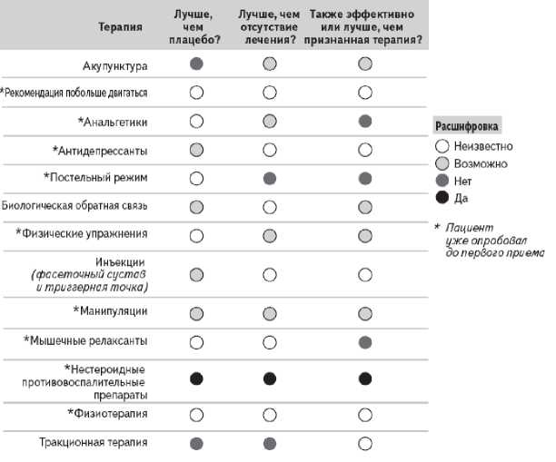 Билл стал практически первым из многих пациентов, которые работали вместе со мной над тем, чтобы исцелиться, а не подобрать лекарства для тела. Вместе мы открыли процессы, которые потом помогли многим раскрыть в себе внутренние целительные силы, которые, по данным исследований плацебо, обеспечивают успех около 80 % всех случаев выздоровления. Мы начали с того, что проверили научные доказательства тех лекарств, которые Билл перепробовал за последние пятнадцать лет, и тех методов, которые он мог бы захотеть попробовать. Особенно нас интересовали такие вопросы: • Какова была общая эффективность от ритуала данного лечения? • Был ли данный метод лучше, чем отсутствие лечения? • Был ли метод лучше, чем другие для такого же заболевания? • Какие были побочные эффекты и возможный вред? • Насколько это было сложно, и какова была стоимость?ЭФФЕКТИВНОСТЬ ЛЕЧЕНИЯ БОЛИ В ПОЯСНИЦЕ БИЛЛА