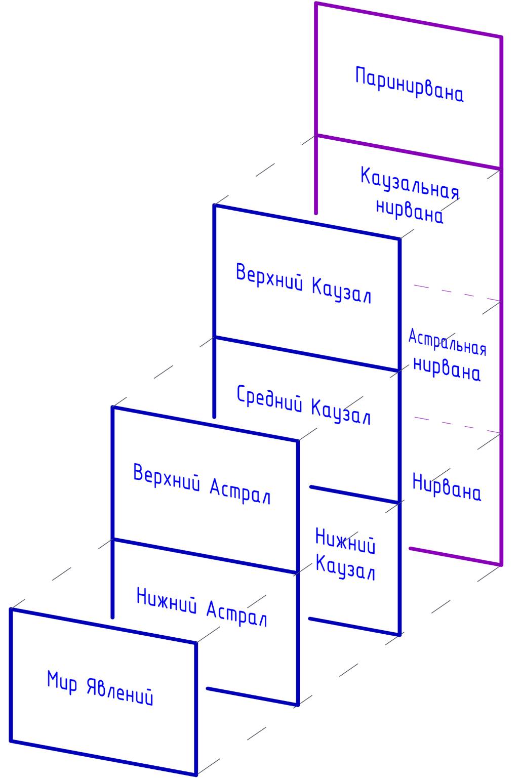 Мир явлений – это мир, в котором мы живём. Физическое измерение. Телесное измерение. Материальная вселенная. Реальность. В буддизме: Камалока (мир Страстей). Мир явлений в неоязычестве называют явью. Астральный мир (астрал) – это мир, в который мы попадаем во сне. Астральное измерение. Душевное измерение. В буддизме: Рупалока (мир Форм). Астральный мир делится на нижний и верхний. Нижний астрал в неоязычестве называют навью. Верхний астрал ещё называют правью. Нижний астрал перекрывает мир явлений. Верхний астрал прямой проекции с миром явлений не имеет. Астрал управляет явью по механизму проекции образов. Явление или предмет, прежде чем проявиться в нашем физическом мире, сначала появляется в астрале как образ. Человека, который имеет духовный уровень, позволяющий ему свободно переродиться в следующей жизни в верхнем астрале или выше, называют «святым». Каузальный мир (каузал) – это мир, который управляет астральным миром и миром явлений. Каузальное измерение. Духовное измерение. В буддизме: Арупалока (мир Без Форм). Каузальный мир делится на верхний, средний и нижний. Нижний каузал перекрывает нижний астрал и мир явлений. Средний каузал перекрывает верхний астрал. Верхний каузал с астралом прямой проекции не имеет. Нижний каузал является навью нави. Средний каузал является правью нави или навью прави. Верхний каузал является правью прави. Каузал управляет астралом по механизму проекции идеи. То есть астральный образ, прежде чем проявиться в астрале, сначала появляется в каузале как идея. Слово «кауза» переводится как «причина». Соответственно, казуальный мир – это мир причин.Мир нирваны