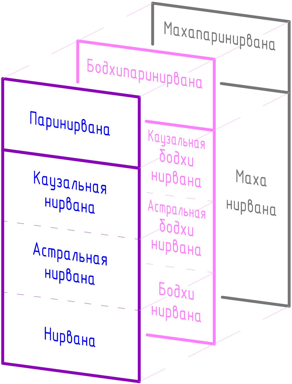 Мир Нирваны – это мир наивысшего Абсолюта. «Нирвана» переводится как «отсутствие волнения». Это состояние освобождения, абсолютного покоя. В сутрах нирвана обозначается как разрушение мирских желаний. Нирвана противопоставляется сансаре, то есть явь, астрал и каузал – это сансара, а нирвана – это не сансара. Различают малую нирвану, нирвану с остатком, паринирвану, бодхинирвану и маханирвану. Малая нирвана. Просто нирвана. Единоличная нирвана. Личность, достигшая нирваны, приходит к этому достижению нирваны (первому достижению освобождения) единоличным путём. Такую личность называют архатом или единолично пробуждённым. Малую нирвану условно можно разделить на каузальную нирвану, астральную нирвану и нирвану мира явлений, в соответствии с тем, какой духовный уровень имеет «освободившийся», и, соответственно, опыт какого мира в горизонтальной проекции он останавливает (отбрасывает). Нирвана с остатком. Под «остатком» в данном термине подразумевается «жизнь», которую архат ещё пока не отбросил. Паринирвана – это самый верхний уровень нирваны, «нирвана без остатка», полностью независимое существование Истинного Эго. «Пари» переводится как «окончательно». Паринирвана не соотносится ни с каким из миров сансары; поэтому невозможно одновременно находиться в состоянии паринирваны и жить. Если архат сразу же после достижения нирваны отбросит жизнь, то он попадёт в паринирвану. «Паринирвана» и «нирвана с остатком» – это антонимы. Мир бодхинирваны. Архат, после достижения нирваны, не останавливается на этом, а расширяет своё достижение, приводя к достижению нирваны другие личности, и преодолевая таким образом узы иных миров, иных заблуждений, которых у него ранее не было. Такую личность называют «бодхисаттва». «Бодхи» переводится как «пробуждение, просветление», а «саттва» переводится как «существо», – существо, устремлённое к пробуждению. Бодхисаттва совершает челночное движение: нирвана – сансара – опять нирвана – снова сансара – нирвана – и так далее. Повторение пути освобождения удваивает опыт этой личности. Затем утраивает. Затем учетверяет. И так далее. Таким образом, у личности появляется всё более и более широкий опыт освобождения, чем просто единоличная нирвана. Такое состояние расширения опыта нирваны называют бодхинирвана. В мире бодхинирваны, соотносительно с миром нирваны, можно выделить верхний уровень: бодхипаринирвану, куда может перейти бодхисаттва после смерти; и нижний. Нижнюю бодхинирвану также можно условно разделить на три уровня в зависимости от того, опыт какого мира разрушается: каузальная бодхинирвана, астральная бодхинирвана и бодхинирвана мира явлений. Мир маханирваны. Когда бодхисаттва обретает опыт освобождения вообще от всех заблуждений, какие только могут быть и в мире явлений, и в астрале, и в каузале, он оказывается в состоянии, что ему больше нечего достигать, он преодолел весь опыт, какой только возможен. Это состояние называется «будда», и это состояние соответствует маханирване. «Маха» переводится как «великая». Поскольку маханирвана соответствует освобождению вообще от всех миров, она делится только на два уровня: маханирвана и махапаринирвана. Махапаринирвана расшифровывается как великое окончательное разрушение мирских желаний. В махапаринирвану ушёл после смерти Будд
