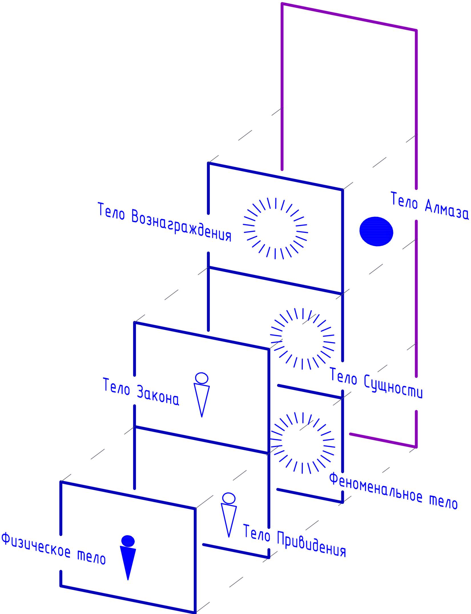 ● Физическое тело – связано с муладхара чакрой. Действует в мире явлений. Чтобы выйти из физического тела в ином теле, йог должен привести физическое тело в изменённое состояние. Например, предельно расслабиться или войти в полусонное состояние (медитативное состояние), или заснуть, или войти в состояние искусственного анабиоза (самадхи). ● Тело привидения – связано со свадхистхана чакрой. Действует в нижнем астрале. ● Феноменальное тело (нирманакая) – связано с манипура чакрой. Действует в нижнем каузале. Может проявить себя в мире явлений как привидение, отделённое от реального физического тела. ● Тело закона (дхармакая) – связано с анахата чакрой. Действует в верхнем астрале. ● Тело сущности (свабавикакая) – связано с вишуддха чакрой. Действует в среднем каузале. ● Тело вознаграждения (самбхогакая) – связано с аджна чакрой. Действует в верхнем каузале. ● Тело алмаза (ваджракая) – связано с сахасрара чакрой. Истинное эго. Пребывает в состоянии нирваны.