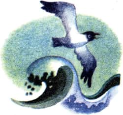 Далеко на севере, на берегу холодного моря жили муж и жена, чукчи. И было у них двое детей: мальчик и девочка. Каждый день чукча уплывал в море ловить рыбу, а дети на берегу собирали морскую траву и улиток. Однажды вернулся отец с моря, вытащил лодку на берег и пошёл с рыбой в ярангу[1]. Говорит брат сестре: — Давай покатаемся на лодке! Отец нас давно не брал в море. Столкнули они лодку в воду и поплыли. Вдруг налетел злой ветер и поднялась буря. Волны стали захлёстывать лодку. А ветер относит, её всё дальше и дальше на середину моря. Плачет сестра, а брат её утешает: — Не плачь! Мы ещё спасёмся. Выбросило лодку на неведомый остров. — Нас тут никто не найдёт! — сказала сестра. — Сюда ни один рыбак не заплывает. Сидят они на земле и плачут. Пролетает над ними чёрный ворон. — Ворон, ворон, — закричали брат и сестра, — помоги нам! — Коок! Коок! — крикнул ворон и улетел. Летит над ними белый лебедь. — Дедушка лебедь, будь добрым, помоги! — Дны-дны-диги! — крикнул лебедь и улетел. Плывёт по волнам большая чайка. — Чайка, чайка, спаси нас! Вышла чайка на берег и говорит: — Как вы попали на этот остров? Я знаю, где ваш дом. Посадила она мальчика и девочку в лодку, накрыла кухлянкой[2] и сказала: — Закройте глаза и не смотрите! И вмиг утих ветер, успокоилось море. А на берегу отец с матерью ищут своих детей. Горюет мать. Отчаялся отец. Вдруг мать закричала: — Смотри, смотри! Это наша лодка плывёт! Пристала лодка к берегу. Улетела чайка. Бросились дети к отцу, к матери, смеются, обнимаются. — Нас чайка спасла! Отправился отец в море, убил гарпуном[3] большого моржа, потом разрубил тушу на куски и разбросал моржовое мясо по берегу. — Пусть чайки едят! Слетелись чайки со всего моря, клюют мясо, кричат. — Пускай и наша чайка поест! — сказали брат и сестра. Много лет прошло с тех пор, как чайка спасла детей. Мальчик стал взрослым мужчиной, а девочка — взрослой женщиной. Пошли они однажды удить рыбу в ледяной полынье. Наловили и себе, и старику-отцу, и старухе-матери. Идут брат с сестрой домой, несут мешки, полные рыбы. А на дороге большая чайка сидит. Растопырила крылья — не даёт пройти! Налетает сзади, выхватывает рыбёшку из мешка. Закричал на неё брат, а сестра подняла камень и хотела бросить в чайку. Заговорила тут чайка: — Вы забыли меня? Не мне ли вы кричали на острове: «Спаси нас, спаси!»? Вытряхнули брат и сестра рыбу из мешков и говорят: — Бери всё и ешь! Разве мы когда-нибудь забудем тебя? Вернулись сестра и брат домой и сказали старикам: — Мы сегодня видели нашу чайку. Она была голодная, и мы отдали ей всю рыбу.