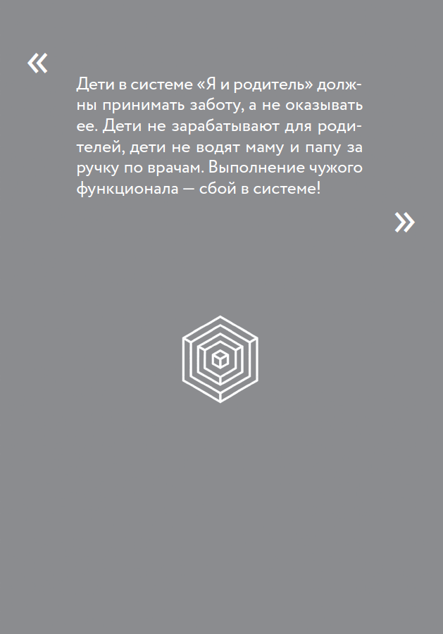 Что не так с Папами? • Постоянно работал. • Не играл. • Не бывал дома. • Не занимался ребенком. • Не создавал атмосферу. • Не веселился. • Не научил водить машину. • Не разрешил собаку и не купил велосипед, в конце концов. Ужасные, ужасные папы! Или нет? Кажется, вы уже догадались, к чему я клоню. Мы разобрались с этим, отыскивая свое место с мамой, теперь справимся и в блоке с папой. Две важные вещи надо заучить назубок: • Папа-Папа и Папа-Мужчина — два разных человека. И мы всегда помним, что для нас есть только Папа-Папа, а в дела Папы-Мужчины мы свой детский нос не суем, «даже если нам немного за…» 70, например. • Папа — это не Мама. У него вообще в семье другие задачи. Он не может и не должен быть мамой. Не его функционал — играть с детьми, нянчить их, воспитывать. Он может, если хочет и умеет, выделить на это время. И это будет прекрасно. Но в Мире Систем он этого делать не должен. Это важно понять и запомнить.