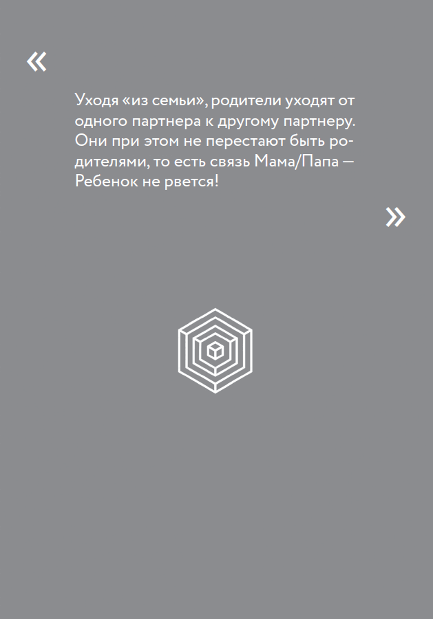Говоря просто: уходя «из семьи», родители уходят от одного партнера к другому партнеру. Они при этом не перестают быть родителями, то есть связь Мама/Папа — Ребенок не рвется!