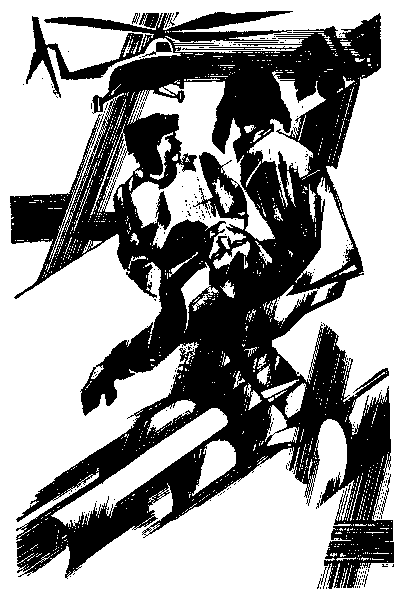Рогов гнал освобожденный от прицепа «Урал» обратно, матерясь сквозь зубы и боясь взглянуть на дно кабины, где лужицей собралась кровь, натекающая из распоротых унтов Костылева; он вздрагивал от острого запаха крови, этого запаха беды, цепенел до паралича и давил, давил унтом на педаль газа, выжимая из «Урала» все возможное. Старенков, сидя рядом, держал на коленях голову раненого, оберегая ее от тряски, хотя оберегать надо было не голову, а ноги. Лицо Старенкова было бумажно-прозрачным, под кожей светились жилки, волокница мышц, лоб обметала испарина, пот странного розового цвета стекал в височные впадины, скатывался на щеки, тек к подбородку. Далеко впереди, над жидким, болезным леском, окаймлявшим лысину песчаной выпуклости, что-то шевельнулось. Будто в белой выси растворился кристаллик снадобья, небо расчистилось, и показалась смуглая точка, превращаясь в голенастое насекомое — не то в кузнечика, не то в стрекозу. — Бригадир! Вертолет! — Рогов поморщился, похоже, что его вот-вот должно вырвать всем теплым, остолбенелым, пережитым, что в нем было. — Верто-о-олет, — вновь пробормотал он. — Тормози! — выкрикнул Старенков, вглядываясь в ветровое стекло. Рогов мягко, упершись спиной в скрипучее пружинное сиденье, затормозил. Под скатами завизжал снег. «Урал» остановился. — Счас мы тебя... Счас мы тебя... — зачастил Старенков, не отрывая глаз от ветрового стекла. — Держи, Рогов, Ванину голову, я вертолет приземлять буду. Он выскочил из машины на белую, как неисписанный лощеный лист, нетронутую моторным выхлопом болотную равнину, хрипя и отплевываясь, словно в драке, стянул с себя ватный бушлат. Рванул его снизу, с разреза пол, но крепкая ткань не подалась. Тогда он, нашарив в кармане стеганых штанов охотничий складень, отщелкнул лезвие и длинным движением отхватил правый борт вместе с рукавом, потом от спинки отделил левую половину, быстро раскинул растерзанный бушлат на снегу. Рогов, приподнялся, ахнул: Старенков выложил низвечный, знакомый по многим книгам: что знает и стар и млад, летный «кирпич», посадочное Т. Бушлат был пятнистым от мазута, плохо просматривался, издали вообще казалось — комки грязи, брошенные на обочину. Старенков в три маха достиг машины, вспрыгнул на выступ бампера. Клацнув оттяжками запоров, откинул крышку капота. — Пустая банка есть у тебя? — прокричал он, ежась от холода. — В кабине, — засипел Рогов, боясь шевельнуться, потревожить Костылева. — Вот тут, у меня под ногами! Старенков рванул дверь, на резиновом коврике нащупал консервную жестянку, донце ее было в густой клейкой жидкости, чернеющие вязкие капли посыпались с ребровины на свитер Старенкова, он задом, ноги врозь, отступил от кабины, взлетел на бампер, вскрикнул, всадившись коленями в радиатор, отвернул краник подсоса, подставил жестянку под бензиновый ручеек. — Э-эх, опоздаем, черт подери! — застонал он. — Опо-оздаем. Улетит стрекозун. Спрыгнул с бампера. Высоко вздергивая ноги в унтах, помчался к раскромсанному бушлату, обрызгал его из жестянки; выхватил из кармана спичечную коробку, сжал щепотью сразу несколько спичек, чиркнул и, в шатком порыве подавшись спиной к дороге, швырнул запаленный огонь в тряпье. Банка была невелика, и вошло в нее бензина, конечно, с гулькин нос, но бушлат вспыхнул таким высоким пламенем, что Старенков схватился за голову — ему по