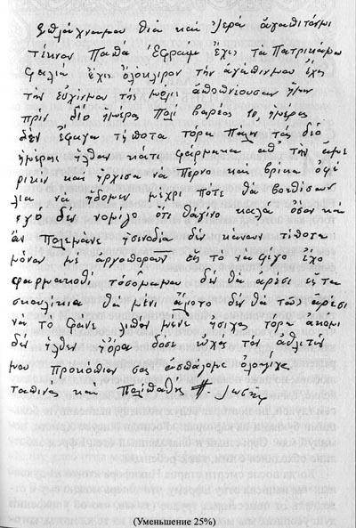 Март, 1992 г. Возлюбленные мои чада, драгоценные мои чада Георгий и Виктория. Вижу, что я совсем плох. Благословение мое да будет с вами. Если когда-либо вас опечалил, прошу меня простить. И вы мною прощены и благословлены. Когда услышите, что я закрыл глаза, если хотите, поставьте за меня свечку. Мне 80 лет. Жалкий отец Ефрем Катунакский.