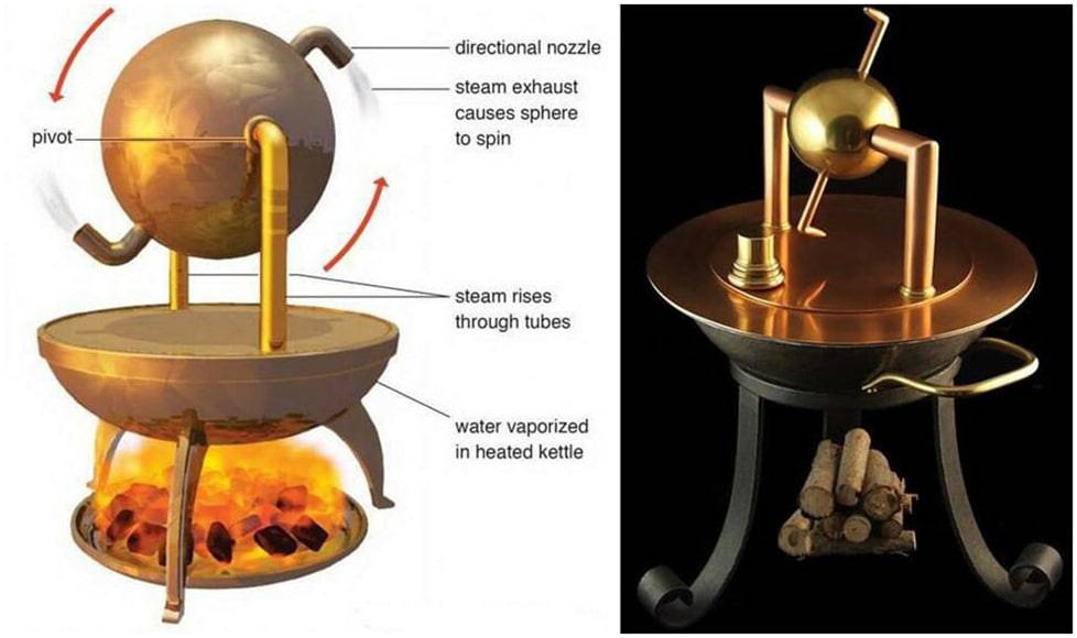 Устройство представляло собой котёл с водой, под ним разводили костёр, вода закипала и вырывающийся пар раскручивал устройство. Современные реплики, сделанные по чертежам Герона, раскручивались до частоты вращения 3500 об/мин. К сожалению, это произошло в Византийской империи, где рабство убивало на корню технологический прогресс, он был экономически не выгоден! Византия была центром научно-технического прогресса, и отказ от развития – привёл к её гибели! Неприступные стены Византии были разрушены из пушек от технологии производства которых они сами отказались! Это урок всем нам – отказ от научно-технического развития ведёт к гибели цивилизации! Сам паровой двигатель был заново изобретён только через 16 веков.