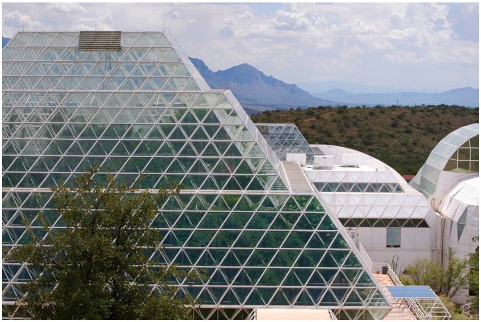 В 1970-х годах американский финансист Эдвард Басс, выходец из богатой техасской семьи, заработавшей миллиарды на нефти, познакомился с Джоном Алленом – экологом, инженером и изобретателем «Биосферы-2». У Аллена были идеи, у Басса – деньги, которые можно было на эти идеи потратить. В 80-х годах эти идеи достаточно выкристаллизовались в проект, на который Бассу не жаль было выделить $150 млн. Аллен планировал поместить 10 квадратных километров земли под прозрачные купола, населить их растениями, животными и людьми. Зачем? Он хотел проверить, насколько гибка жизнь, возможно ли заключить ее в герметичную коробочку и сможет ли она в ней существовать сбалансированно. К тому же «Биосфера-2» могла показать (хотя бы примерно), сможет ли человек взять с собой привычную среду обитания для колонизации других планет. Стройка началась в 1987 году в штате Аризона. Она осложнялась тем, что оконные уплотнители и прочие конструкции должны были быть максимально воздухонепроницаемы, дабы свести протечки воздуха к минимуму. В противном случае команда не смогла бы фиксировать изменения в плотности кислорода под куполом. Всего в «Биосфере-2» было сконцентрировано 180 тонн воздуха. Так как в течение дня воздух нагревался от солнца и расширялся, а ночью, наоборот, сжимался, инженерам пришлось нивелировать эти перепады давления. Для этого было решено построить огромные куполообразные диафрагмы, которые называли «легкими». Всего в здании на старте находилось порядка 20 тонн биомассы, представленной 4 тысячами видов. При этом ожидалось, что 5—20% из них попросту вымрет. Вся эта биомасса была распределена по пяти диким биотопам (тропический лес, мини-океан с коралловым рифом, мангровые болота, саванна, туманная пустыня) и еще двум антропогенным – поля и огороды, а также жилые зоны с лабораториями и мастерскими, где властвовал человек. Меньше всего места занимал океан – всего 450 квадратных метров, тогда как поля и огороды для восьмерых будущих «бионавтов» занимали площадь в 2500 квадратных метров. На них поселили четверых коз с козлом, 35 куриц с тремя петухами, двух свиноматок и хряка. В местном пруду обитала рыба. Разделительная зона между биотопами на переднем плане и океан – на заднем