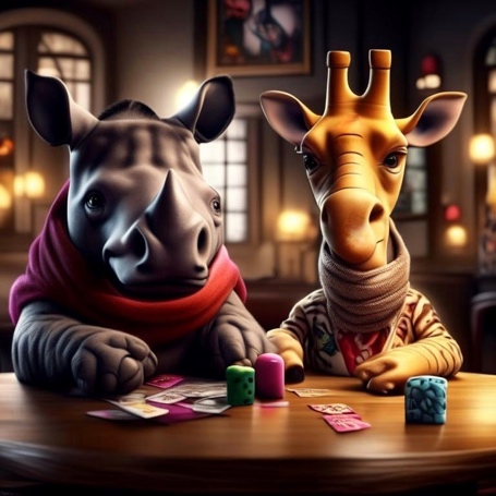 За столом сидят Жираф, Носорог и Снеговик. Они уже отобедали, теперь играют в карты, неторопливо потягивают напитки и наслаждаются неспешным диалогом. Жираф и Носорог закутаны в тёплые пледы, у Жирафа плед синий, как океан, а у Носорога ярко-красный, чтобы он не так сильно скучал по солнцу. На их шеях красуются специально для них связанные шарфы с фантазийным узором, напоминающим о просторах Африки. Конечно, шарф Жирафа раза в четыре длиннее. У Жирафа и Носорога в кружках душистая хвоя и маленькие ягодки, заваренные талой водой (все же знают, что талая вода имеет неповторимый вкус). Снеговик пьёт молочный коктейль, украшенный снежинками и разноцветными кубиками льда. На нём нет ни шарфа, ни пледа. Только ведёрко украшает его голову. Зато какое ведёрко! Оранжевое, блестящее, оно не может не привлечь внимание на фоне сине-белой гаммы их комнаты. Кажется, снеговик очень доволен своим новым ведёрком, привезённым из далёкой Африки. И, безусловно, он рад, что друзья по достоинству оценили и сразу надели его подарки — шарфы и пледы. Друзья смеются в полголоса. Груда тёплых курток в углу еле заметно поднимается и опускается. Давай заглянем кто там? Это же спит Квокка! Милый зверёк размером не больше кошки, даже во сне, кажется, улыбается. Интересно, что собрало в этой комнате такую разношёрстную (в прямом смысле этого слова) компанию?