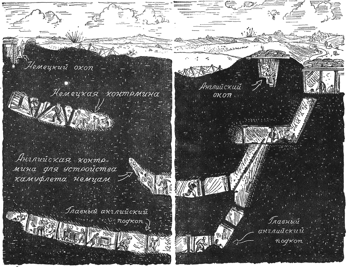 К началу первой мировой войны появились пушки такой скорострельности и снаряды такой разрушительной силы, что казалось, не устоит перед ними ни одно оборонительное сооружение. Стали поговаривать, что подземная война устарела, что будет теперь молниеносная война и солдатам некогда будет в земле копаться. Особенно шумели немцы. Они еще тогда мечтали о молниеносной войне. Но история рассудила иначе. Года еще не прошло, а уж встали друг против друга многомиллионные армии, окопались, опутались проволокой, залепились бетоном, ощетинились пушками и пулеметами — ни туда ни сюда. Нечем рвать фронт, да и только. Танков тогда не было, авиации настоящей — тоже. День и ночь артиллерия месит землю, день и ночь передвигаются войска вдоль фронта на тысячный манер, да что толку-то! Эдак можно их и десять лет передвигать. И сидят генералы над картами, как шахматисты над шахматными досками, раздумывают: — Что же это творится, господа? Вроде ничья! Но война не шахматы. На войне ничьих не бывает. Надоело англичанам стоять, упершись в немецкие укрепления. Просят инженеры командование: — Разрешите немцев подкопом на воздух поднять. Генералы удивились: — Да вы понимаете, что говорите? Тут не крепость какую-нибудь, а фронт надо ломать километров в пятнадцать длиной. Надо тысячи метров под землей с кирками пройти! Целый поезд взрывчатки подвести под немецкие позиции! — Понимаем, — докладывают инженеры. — Здесь у нас все подсчитано… Разрешите начать подкоп. Генералы согласились. Близ города Лилля, в районе местечка Виштаете, англичане начали беспримерный в истории подкоп. На семидесятиметровой глубине, вдвое глубже самых глубоких тоннелей Московского метро, повели они грандиозное подземное наступление. Кирками, лопатами, отбойными молотками яростно вгрызались в землю минеры-землекопы. Трудная была это работа. Иногда землекопов поражали припадки странной болезни: железным обручем давила головная боль, обморок валил с ног. То была минная болезнь — от нехватки воздуха, от подземных удушливых газов. Вода заливала минные галереи, ползучие глины сплющивали деревянные крепи, но неуклонно, наперекор всему продвигались вперед подземные солдаты. Все ближе подходили к немецким позициям страшные минные галереи. А уж немцы учуяли, что идет подкоп. Кинулись рыть контрминные галереи. Все подняли на ноги. Вылетела воздушная разведка. Геологи, переодетые в английскую форму, пробирались в расположение англичан, но и по цвету породы нельзя было узнать, на какой глубине идет подкоп. Чисто работали англичане, даже породу в зашитых мешках увозили в глубокий тыл. ⠀⠀ ⠀⠀ ⠀⠀Мины и контрмины периода первой мировой войны 1914–1918 годов ⠀⠀ ⠀⠀ ⠀⠀