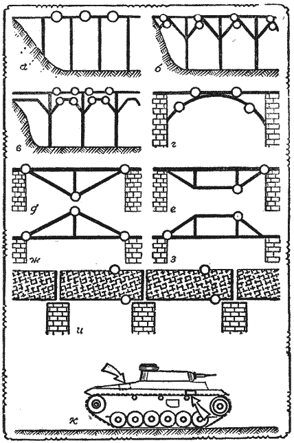 ⠀⠀ ⠀⠀ ⠀⠀ Крадется партизан с мешком взрывчатки к железнодорожному мосту. Давно ли глядел он на этот мост беззаботными глазами? А теперь одна задача — взорвать мост. Это дело теперь важнее жизни. Мост пропускает тяжелые фашистские танки. Смерть мосту! ⠀⠀ ⠀⠀ ⠀⠀Смертельные узлы: a, б, в, г, д, е, ж, з, и — заряды при подрывании мостов; к — как подрывают танк. ⠀⠀ ⠀⠀ ⠀⠀