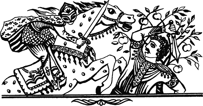 Некогда жил царь. У него было три сына. Однажды отец говорит: — Сколько лет царствую, но ни разу не был на границах моего царства. Не знаю, что там делается. Пойду-ка погляжу. Стал обходить, проверять — границы в порядке. И только хотел возвращаться восвояси, видит — сад. Только что ничего не было, и вдруг — фруктовые деревья. Ломятся они от обилия плодов, отяжелевшие ветки едва держатся на подпорках. Румяные яблоки сверкают под лучами солнца, глянешь на них — видишь свое лицо, и зеркала не нужно. Но сад стоит не на земле его царства, а на границе. — Царь, жить тебе, поживать, — говорят люди (он же не один пошел, с ним назиры-визиры, вся свита, а полк солдат не сводит с него глаз), — разреши съесть по яблочку, и двинемся в путь домой. Согласился царь. Вошли в сад. Только хотели сорвать по яблоку, как с запада показалась черная туча. Когда она приблизилась, все увидели, что это не туча, а молодец на добром коне. — Что это? — спрашивает он. — Никогда такого не бывало: всем полком вошли в сад и разоряете. Яблок на всех не хватит. Уходите, а то раскромсаю всех. Люди царя слова всадника ни во что не ставят — мол, что сделает один молокосос с целым полком, хвастается просто. Но всадник как начал кромсать с одного конца, так вмиг дошел до другого. Не оставил в живых ни одного человека. Убил и царя. Потом очистил сад от мертвецов, выбросил их за забор и уехал. Прошли год-два, царица посылает гонцов во всестороны, беспокоится, где же царь и его люди? Все говорят: «Приходил, ушел», «Был здесь, ушел». Вот приходит к матери старший сын: — Мама, может, я пойду? — говорит. — Обойду границы, посмотрю, где отец. — Иди, сынок, — говорит царица. Взял сын полк солдат и пошел по следам отца. Шел, шел, дошел до того сада. Видит — вокруг кости валяются, царский крест и корона тоже здесь. «Значит, здесь была война, на которой погиб и отец», — думает сын. Выкопали яму, похоронили всех; царя, конечно, отдельно. На его могиле поставили надгробную плиту. И только хотели вернуться домой, кто-то говорит: — Съедим из этого сада по яблоку и пойдем дальше. Вошли они в сад, а с запада снова появилась та черная туча, показался тот же молодец. Видит — снова точно так же разоряют его сад. — Это уже второй случай, — говорит. — Что это, пришли, вошли в чужой сад и поедаете яблоки? Чтобы не растягивать сказку, скажу: снова началось побоище, снова таинственный всадник мечом искромсал всех, выбросил трупы за забор и уехал. А царица, оставшись с двумя сыновьями, ждет, ждет, но нет ни мужа, ни старшего сына. Средний сын говорит: — Мама, может, и я пойду? — Иди, сынок, — говорит мать. И этот взял полк солдат и отправился по тому же пути. Точно так же, как и старший, обошел границы, пришел и увидел: могила отца, а рядом — старший брат мертвый лежит и солдаты. Похоронили брата рядом с отцом, зарыли солдат. Задумался средний сын: «Видно, младший брат придет меня хоронить». После похорон зашли в тот злополучный сад за яблоками. Снова с запада показалась черная туча, явился всадник. — Что за напасти, уже третий раз! — говорит. Снова искромсал всех, выбросил за забор и удалился. И осталась мать с одним младшим сыном. — Мама, — говорит младший, — что будет? И отца нет, и двух братьев. Остались мы вдвоем, может, и я пойду? — Нет, сынок, — говорит мать, — они пошли, пропали без вести, не хочу лишиться и тебя. Но сын настаивал, и мать согласилась.