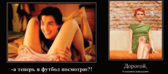 1. Самая намекогенная тема, как и следовало ожидать - секс, эротика. В ходе примерно пятилетнего мониторинга и целевого поиска в интересах предшествующих исследований было просмотрено всего около 50 тыс. демотиваторов, из лишь около трети оригинальных (в целевом поиске оригинальны почти все, но в общем объеме преобладал мониторинг). Из них около 10%, то есть 1,7 тыс. по теме, и среди них - 94 демотиватора с намеками, то есть около 5%, характерные примеры - рис. 12, 13. Здесь и далее приводятся именно характерные примеры, то есть демотиваторы, в которых использованы наиболее частые в этом сегменте мотивы; оригинальность идеи, согласие с каноном, сложность и "тонкость" намека не учитываются.