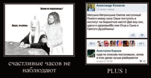 6. Религии - тема не является табуированной. Поэтому, хотя шутки и издевки есть, но намеки единичны, замечено лишь 2 случая из 249, т. е. 0,8%; именно как реверанс политкорректности, приведем оба два примера - рис. 26, 27.