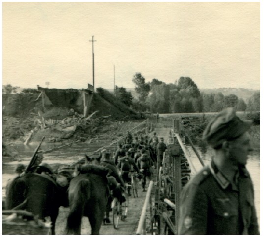 10 сентября 1939 г. снова начались столкновения с преследуемым противником. Со своим взводом стрелков-мотоциклистов я ворвался в город Санок, где завязался непродолжительный уличный бой. Сопротивление врага было быстро подавлено при поддержке артиллерии и противотанковых орудий. Санок был маленьким городком, населенным преимущественно только евреями. Они повсюду сновали с длинными бородами и в капотах, так выглядели даже молодые парни. Наши пешие группы сформировали из евреев отделения для переноски боеприпасов и снаряжения. К моей самой большой неожиданности один из евреев заговорил со мной по-баварски. Загадка была быстро решена – оказалось, что среди них было много выходцев из Германии, бежавших оттуда в 1933 г. Все евреи пытались нам что-нибудь продать, и как можно дороже, но нашим солдатам хватило ума не делать покупок! В полдень мы достигли городка Загуж на реке Сан. Наши передовые отряды вышли к реке, отбросив противника и вынудив его отступить. На мотоциклах с помощью саперов в мелком месте я пересек русло реки. Саперы, стоя по пояс в воде, переправили нас на плотах на другой берег, продолжая быстрыми темпами строить понтонный мост.
