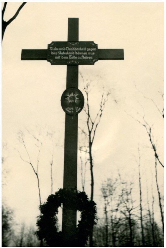 Памятный крест в честь павших горных стрелков на кладбище героев в Сен-Гобене (надпись на кресте – «Любовь и благодарность к Родине может остановить только смерть»)