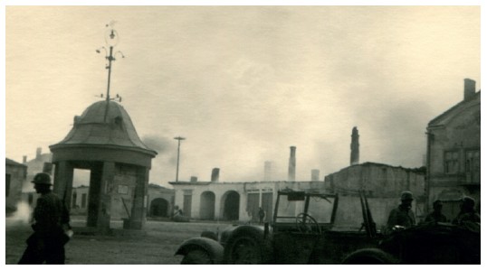Мы прошли мимо деревни и горящих останков разрушенного самолетами вокзала. Наши штурмовые группы оставили после себя обгоревшие остовы грузовых вагонов и возвышающиеся в небо дымоходы с остатками стен. К вечеру мы достигли Ольшаницы, ее было видно издалека, полыхающую в зареве пожара, и перед нашими глазами предстала на редкость красивая картина войны. Дальше путь лежал между горящими домами. То, что пощадила война, мы использовали для ночлега. Егеря, прошедшие за день почти сорок километров, разместились в роскошном старинном поместье. Противник отступал все быстрее и быстрее на восток, повозки с лошадьми с брошенным военным снаряжением выстроились вдоль улиц.