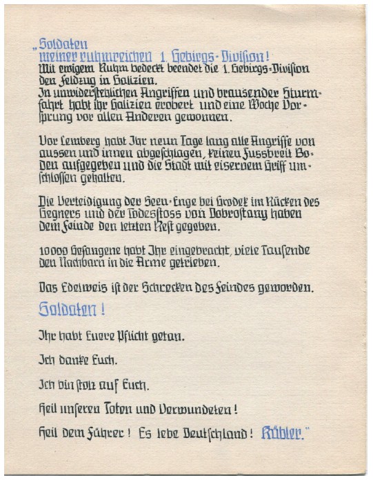 Снова, как в Галиции и под Лембергом, вы выполнили свой долг. Снова, как в Польской кампании, Первая горнострелковая дивизия следовала далеко впереди наступающей армии. Я благодарю вас за храбрость и верность. Бессмертная слава увенчала Первую горнострелковую дивизию. Гордитесь! Мы приветствуем Родину! Да здравствует наш вождь! Кюблер