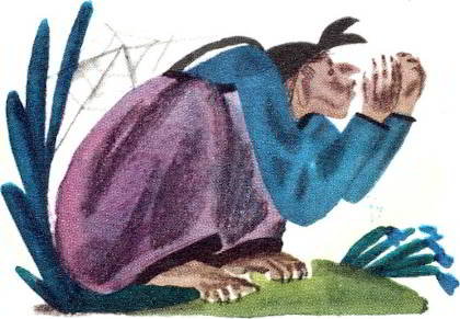 Терёшечка обознался и подплыл к бережку. Ведьма его схватила, в мешок посадила и побежала.