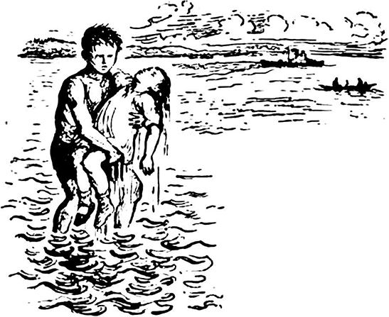 Поравнявшись с плотом, мы стали кричать, чтобы нас перевезли. Ветер дул в нашу сторону, и на наш крик никто не отзывался. Кричали долго, до хрипоты. Махали руками, шапками. Никто нас не заметил. Наступала ночь. — Поедем на брёвнах, — предложил Петя. — А переедем? — спросил я, посмотрел на широкую мутную реку, и мне стало жутко. — А мы на гвоздиках! Вот они! Ведь не зря их дал нам Анатолий Михайлович. Мы спустились к воде и стали искать дощечки или палки, чтобы при помощи их сколотить пару брёвен. Не так-то просто оказалось подобрать что-либо подходящее на пустынном берегу. Разошлись в разные стороны по берегу и кое-как, с большим трудом подобрали длинные палки. Стали ловить проходящие возле берега брёвна. Плыли они редко-редко, и не каждое можно было достать багром. Не скоро, но всё же подтянули к берегу четыре бревна и соединили их попарно. Попробовали оба встать на два бревна, но чуть-чуть не выкупались. Надо переправляться врозь: Петя — на своих брёвнах, я — на своих. Первым от берега оттолкнулся я. Меня сразу подхватило течение и понесло. Стараюсь выводить свой плот на середину реки. Ударяю багром по воде, а брёвна при каждом ударе наклоняются то в одну сторону, то в другую. Стало страшно. Пытаюсь повернуть обратно, к берегу, но не могу. Меня тащит и тащит вниз по течению, и всё время относит от берега. Чем дальше от него, тем больше волн. Ноги стало заливать. Белые барашки плещут в брёвна, и они наклоняются, ныряют. Я старался сохранить равновесие и багор держал перед собой поперёк. Петя был недалеко от меня. Он стоял на брёвнах и несмело опускал и подымал багор. Нас вынесло на середину реки. Брёвна стало заливать водой. — Петя! — закричал я, стараясь перекричать шум волн и порывы ветра с дождём. — Эгей!.. — глухо донеслось до меня. — К берегу надо, к берегу-у-у! — кричу я. — Ладно-о-о! — донеслось опять со стороны Пети. Тогда я с силой стал колотить багром по воде, пытаясь повернуть брёвна к берегу. Брёвна закачались так, что я потерял равновесие и упал. Ухватился за брёвна и стал вползать на них. Вода хлестала меня в грудь, в лицо. Я захлёбывался, но кое-как вполз, встал на колени и обеими руками держался за скользкие заливаемые волнами брёвна.