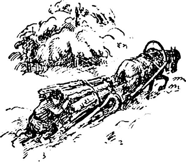 Дорога вошла в лес. Справа и слева от меня — сказочный дворец. На лапах ельника снег. Так причудливы снежные наросты на деревьях, что диву даёшься! Вот пень. На нём вырос огромный гриб-дождевик, какие бывают летом на луговых полянках. Толстая сужающаяся книзу ножка, а выше на ней шар, похожий на футбольный мяч, только гораздо больше. А вон ещё такой же снежный гриб, и ещё, и ещё. Эх, если бы да летом были такие красивые пни! Въезжаю под снежную арку. Снег пригнул рябину к земле, засыпал вершину, и образовалась огромная дуга с песцовым горжетом наверху. Проезжая, не вытерпел: встал на дровнях во весь рост и ударил топором по согнутому дереву. Рухнул снег на меня, на дровни, и закружились в морозном воздухе бесчисленные блёстки, оседая на дорогу. А на снегу всюду следы. Вот от одного пня до другого протянута по снегу мелкая ажурная строчка, да такая красивая и точная, что глаз не оторвёшь. Это мышка вышла ночью из тёплого подснежного жилья, понюхала морозный воздух и не юркнула обратно, а невидимо перебирая ножками, прострочила нежную строчку до другого пня и, пробуравив с хода рыхлый снег, ушла в него. А это вот заяц неторопливо, с остановками, прислушиваясь к ночному лесу, проковылял по лесной поляне, легко отталкиваясь широкими лапами от рыхлого, по пояс человеку, снега. А это что? Около кустов на лесных полянах, ровно, с точными промежутками друг от друга, натыканы по снегу ямки, как будто зубчатое колесо прокачено от куста к кусту. Это лиса принюхивалась и прислушивалась, обходя многокилометровые лесные владения в поисках добычи. Когда я въехал в березник, то увидел на небольшой поляне снежные норы с бугорками и с разлётом снега по краям. Остановил Воронка, слез с дровней и, проваливаясь по колено в глубоком снегу, заглянул в одну норку. Да это же подснежное глубокое убежище, уходящее в сторону! На дне убежища видны перья и много, целая горсточка, мёрзлых желтоватых шишечек, похожих на весенние серёжки берёзы. Это зимние квартиры тетеревов, в них они проводят в глубоком сне длинные зимние ночи. А вот и мой поворот. Никто по нему не проходил, не проезжал. На дороге глубокий снег. Лишь следы зверей исписали её во всех направлениях. Снег рыхлый, и Воронко тащит дровни, не останавливаясь. Я стою на коленях и держу в руках туго натянутые вожжи, готовый в любую минуту повернуть, куда нужно. Вот Воронко споткнулся, чуть остановился и с трудом вытащил ноги. На снегу осталась грязь, смешанная со снегом. Значит, не везде под снегом замерзло! Вот здорово! Костёр дров, к которому я подъехал, был похож на широкий белый сугроб, наметенный под деревьями. Как хорошо сделала мать, положив мне на дрова лопату! Воронко ест сено, на котором я сидел, а я разгребаю снег. Неужели холодно? Я работаю без рукавиц, полушубок лежит на снегу, покрываясь инеем, а мне жарко. Из-под снега показываются оледеневшие толстые кряжи. Стучу по ним топором и с трудом наваливаю их на дровни. Сколько положить-то — не знаю. Наверно, хватит? — Хватит? — спрашиваю Воронка, который нет-нет да и покосится на меня умными глазами, как бы говоря: — клади, клади, но знай, что до хорошей дороги не близко, вывезем ли? Тяжело идут дровни с дровами. Воронко часто останавливается.