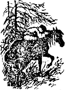 Я сидел неподвижно, не спуская глаз с великана. Я видел, как легко вибрировали его ноздри и мелко дрожала шерсть… На широкой лопасти его рога ползала оса. Она бойко двигалась и, казалось, как будто что-то разыскивала. Любопытство сильнее страха. Лось опустил голову и вытянулся в мою сторону до того резко, что казалось, вот-вот упадёт. Тогда он бесшумно приподнял переднюю ногу и тихо поставил её ближе ко мне. Он потянулся ко мне, маленькому человечку, забравшемуся в лесные дали, и старался узнать, кто я. Или он уловил запах человека, или его удивили мои испуганные, широко раскрытые глаза, — не знаю. Лось тревожно и коротко фыркнул. Мгновенно поднял голову, подобно стальной пружине вздыбился и, сильно бросив себя в сторону, умчался. Всё это произошло так неожиданно, что я долго не мог сообразить, что со мной было. Лишь на моём лице, словно что-то вещественное, чувствовалось дыхание лесного великана.