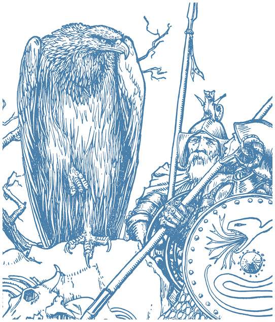 Я поведаю вам сказ о крапивнике[65]. Жил-был фермер, который искал слугу. И вот однажды крапивник прилетел к нему и спросил: «Кого ты ищешь?» «Я ищу работника», — ответил фермер. «Ну, тогда возьми меня», — предложил крапивник. «Да какой с тебя, мелкое ты создание, толк?» «А ты меня испытай», — ответил крапивник. Тогда фермер дал ему первое поручение — молотить зерно в амбаре. Крапивник начал молотить и выколотил одно зернышко. Но вдруг откуда ни возьмись вылезла мышка и съела это зернышко. «Я очень прошу тебя больше так не делать», — тогда сказал крапивник. Он снова принялся за работу и на этот раз выколотил два зернышка. И снова выскочила та же мышка и съела их. Тогда они решили устроить битву-состязание, чтобы выяснить, кто сильнее. «Приводи все свое племя», — сказал крапивник. «И ты тоже», — ответила мышь и попыталась ударить его лапкой. Но крапивник отбил удар своим цепом. В назначенный день состоялась решающая битва. Крапивник привел отряд из двенадцати птиц, а мышка — свое войско. На сражение также явился сын короля Тетертауна. Он хотел рассказать об этом отцу-королю, которому в этом году предстояло стать королем всех божьих тварей. Однако почти вся битва закончилась еще до его прибытия, за исключением одной схватки между большим черным вороном и змеей[66]. Сын короля увидел, как змея обвилась вокруг вороньей шеи, а ворон вцепился клювом в ее голову. Когда казалось, что змея вот-вот одержит победу, он бросился на помощь и с одного удара отсек ей голову. Переведя дух, ворон взглянул на мертвую змею и сказал своему спасителю: «За твою помощь я отплачу добром, и ты увидишь нечто необыкновенное. Садись мне на спину, между крыльями». Сын короля обхватил ворона, и тот взмыл в небо. Они пересекли девять ущелий, девять долин, девять горных пустошей. «А теперь, — сказал ворон, — видишь тот дом? Иди к нему. Там живет моя сестра; и клянусь, ты будешь там желанным гостем. Если она спросит: “А ты был на битве птиц?” — скажи, что был. Если спросит: “ Видел ли ты кого-то, похожего на меня?” — ответь, что видел. И помни: завтра утром я снова буду ждать тебя здесь».