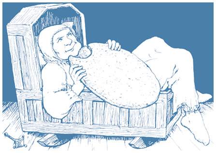 Переодетый в ребенка Финн ест лепешку. Иллюстрация Джона Д. Бэттена из книги «Кельтские сказки» Джозефа Джекобса, 1892 г.