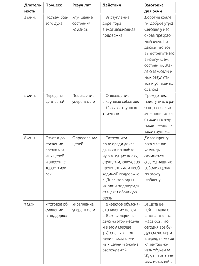 Также компания количественно оценивает результаты генералов по двум критериям. Первый касается персонала: генералы должны набирать и формировать команды численностью более 10 человек, а достижения годовой производительности на одного сотрудника в их подчинении должны составлять не менее 2 миллионов юаней. Второй критерий — показатели по результатам, которые требуют от каждого сотрудника заключать не менее одной сделки с директором школы каждый месяц. Раздел о модели управления Компания разработала модель управления для генералов и назвала ее моделью «211». Здесь двойка означает два отбора: отбор квалифицированных кадров и отбор клиентов, а единицы — одну стратегию и одно наставничество. Менеджер, в числе прочего, обязан отбирать квалифицированных специалистов. В руководстве для генералов мы делимся описанием характеристик, навыков и качеств, которые компания ищет в своих потенциальных сотрудниках, рассказываем, как и где искать талантливых людей, а также подробно объясняем процесс отбора. Каждый этап детализирован до мельчайших действий. Например, если генерал ищет кандидатов на платформе BOSS (Boss Direct Recruitment), он может прочитать в руководстве, как именно нужно действовать: как представлять себя, как приглашать кандидатов, как их заинтересовать, как проводить интервью, как оценивать личные и профессиональные качества… Также в руководстве детально рассказывается об использовании таких инструментов, как «форма оценки ценностей» и «оценочный лист для собеседования». Еще одна управленческая задача генерала — отбор клиентов. В нашем руководстве подробно описан портрет клиента, рассказано, где его искать и как с ним работать. Каждый ключевой шаг, инструмент и этап должны быть стандартизированы. Только структурируя, упрощая и делая процесс понятным даже для новичков, можно добиться того, чтобы сотрудники быстро его осваивали. Когда сотрудники и клиенты подобраны, генералу необходимо определить основные направления работы и составить план действий. В Action Education генералы проводят курсы и работают с ежедневными предложениями. Для проведения курсов вся карта боевых действий четко прорисована: в руководстве рассказано, что нужно делать до курса, во время курса и после него. План детализирован по часам с указанием конкретных действий, ответственных лиц, проверяющих, а также соответствующих мер поощрения и наказания. Последний модуль касается наставничества генерала в команде, а также методов и процессов в этой сфере. Методы наставничества включают психологическую поддержку, совместное формирование видения и оценку эффективности. Процессы наставничества детализированы по месяцам, неделям и дням с указанием конкретных действий и результатов, которые должны быть достигнуты. Пояснено, например, как проводить еженедельные оценки производительности, как организовывать утренние и вечерние собрания. В наставничестве на утренних собраниях каждый шаг должен быть детально стандартизирован: по длительности, процессу, результату, действиям и даже заготовкам для речи (см. табл. 4–4).
