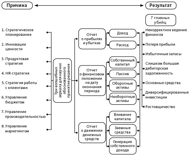 Я уверен, что, прочитав о трех финансовых отчетах, вы осознали их ценность. В трех волшебных зеркалах мы можем увидеть семь основных убийц бизнеса. У всего есть причина и следствие, и эти семь убийц лишь финальные результаты, отображаемые в отчетах. Чтобы действительно решить обнаруженные проблемы, нужно понимать, что их корни уходят далеко глубже финансового уровня и кроются среди восьми основных модулей управления бизнесом. Убийца № 1: некорректное ведение финансов Почему многие компании не могут предвидеть риск разрыва денежного потока? Причина кроется в некорректном ведении финансов. Обычно виновник финансовой неразберихи — это сам владелец. Либо он вообще не разбирается в отчетности и вмешивается в ее подготовку, превращаясь в слепоглухонемого, либо он нанимает некомпетентных людей, выбранных по принципу кумовства: назначает родственников на финансовые должности. В результате финансовая отчетность компании становится некорректной, отчеты не отражают реального состояния бизнеса и невозможно четко и точно определить доходы, затраты, прибыль, амортизацию, распределение расходов и так далее. Чтобы решить эту проблему, необходимо соблюдать правила финансовой отчетности и с самого начала стандартизировать отчеты. Только так компания сможет своевременно выявлять различные операционные риски и принимать правильные решения. Почему публичные компании должны строго соблюдать финансовые стандарты? Потому что финансовая дисциплина — это первый и основной закон бизнеса. Убийца № 2: потеря прибыли Вы можете как угодно хвалить свои управленческие способности, но стоит лишь взглянуть на отчет о прибылях и убытках, как настоящее положение дел станеточевидным. Цифра в графе «Убытки» — это следствие, а в чем истинная причина проблемы? В отсутствии фокуса у компании. Из-за этого она распыляется и вкладывает деньги в нерезультативные направления. Например, стратегия компании не сосредоточена на главном: владелец не понимает границы своего бизнеса и не знает, чем ему не следует заниматься. Или компания не способна сфокусироваться на одной ключевой ценности, ей не хватает инноваций. Или продукт не до конца продуман, поэтому клиент не видит в нем ценности. Или компания тратит много ресурсов на незначительных клиентов, нет фокуса на одну конкретную группу. Все это может привести к убыткам. Убийца № 3: избыточные запасы Почему возникают избыточные запасы? Тоже из-за отсутствия фокуса. Когда вы пытаетесь охватить слишком широкий ассортимент продукции, ценность для клиента неизбежно оказывается недостаточной. Если ваше предложение ничем не отличается от предложений конкурентов, оно теряет свою конкурентоспособность. В итоге компания производит не товар, а запасы, потому что продукцию просто невозможно продать. Поэтому управление компанией должно быть ориентировано на клиента: сначала клиенты, потом продукт; сначала рынок, потом производство. Убийца № 4: слишком большая дебиторская задолженность Почему у компании возникает большая дебиторская задолженность? По сути, это происходит из-за того, что продукт неконкурентоспособен. Его приходится продавать в кредит, чтобы захватить рынок. В итоге товара нет, но и деньги не возвращаются. Хотя вы упорно зарабатывали в течение десяти лет, однажды вы можете потерять все. Я сам сильно о
