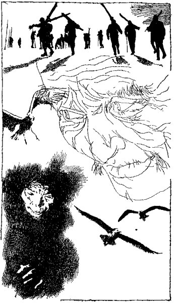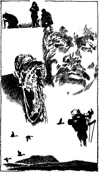 Санька греб, стараясь не брызгать веслами и держать лодку наперерез течению. Птичий Убийца чуть свет удрал в неизвестном направлении, и Санька отправился на охоту один. Желтая вода несла вырванный с корнем куст. По временам куст переворачивался на воронках, и казалось, что кто-то тонущий призывно и безнадежно взмахивает рукой. На другой стороне Китама начинался песчаный заросший травой вал. Знаменитые здешние ветры превратили этот вал в цепочку дюн, между которыми посвистывал ветер. Свист ветра сразу настроил Саньку на одиночество. Он вытащил лодку на берег, подумав, воткнул в землю весла, привязал к ним носовую веревку и шагнул вперед. Ошалевший весенний заяц выпрыгнул из-под самых ног и поскакал вдоль реки. Санька опомнился и сдернул через голову ружье, когда заяц был уже метрах в пятидесяти. Он щелкнул, не помня себя, курками и вскинул ружье. А заяц вдруг точно провалился в самый нужный момент. Санька чертыхнулся и бегом двинулся за ним. Он бежал согнувшись, не чувствуя на ногах тяжелых сапог и неловкой тяжести поясного патронташа, но заяц, наверное, в самом деле провалился сквозь землю, и Санька повернул от реки. Он шагал теперь с ружьем наготове, шагал, хищно пригнувшись, не замечая, что́ у него под ногами, не замечая расстояния. Он услышал крик. Две длинноногие коричневые птицы уходили от него плечо в плечо и трубно кричали. — Журавли, — понял Санька. Он еще сильнее пригнулся и двинул к ним почти бегом, но журавли стали уходить еще быстрее и вдруг тяжело взлетели, не переставая кричать. Они прошли метрах в десяти над ним, длинношеие громадные птицы, и Санька видел длинные концы маховых перьев на крыльях и черный тревожный глаз, обращенный к нему. Он все сильнее сжимал в руках ружье с взведенными курками, но что-то помешало ему стрелять. Он только смотрел на них и повторял про себя: «Ах ты, черт! Ах ты, черт побери!» Журавли прошли над ним и улетели дальше, трубноголосые и печальные. Но Санька уже забыл о них и снова шагал дальше, все так же согнувшись. Несколько раз в стороне прошли гуси. Они летели ему навстречу, но метров за триста вдруг делали разворот и проходили в стороне, как уверенные тяжелые фрегаты. Санька не знал, сколько времени, в какую сторону он шел, и остановился только, когда пот стал едко заливать лицо и глаза. Он выпрямился и осмотрелся. Свинцовая лента Китама куда-то исчезла, и домики рыбалки, видные издалека, тоже исчезли. Кругом была ровная грязно-желтая тундра с редкими проплешинами снега в провалах низин. Когда-то здесь была страна мелководных озер, образовавшихся на месте ледяных линз, но потом вода исчезла, просочилась сквозь земляные трещины, и получились «сухари» — гладкие сухие блюдца с обрывистыми берегами и редкой осокой на потрескавшейся глине дна. Между сухими озерами оставались перемычки кочковатой, в мертвой прошлогодней траве тундры, и кое-где торчали группами и в одиночку курганной формы бугры. — Надо залезть на бугор, — сообразил Санька. Он зашагал к ближнему. Идти было очень неловко. Ноги соскальзывали с травянистых голов кочек, и он несколько раз плюхнулся на бок, пока не понял, что гораздо выгоднее ступать между кочками. Холм, который казался совсем рядом, все удалялся и удалялся; Санька, разозлившись, все ускорял шаг и вдруг заметил на вершине холма четкую фигуру человека. Человек был высок, стар, ху