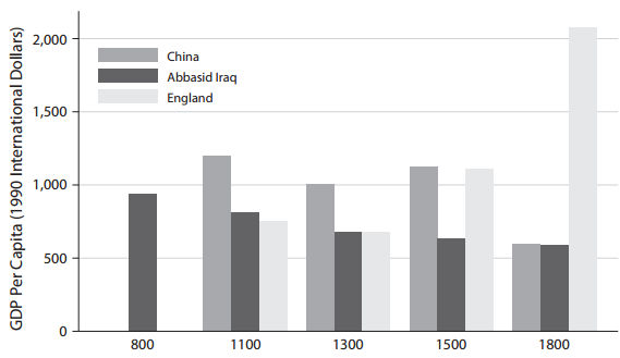 Какие факторы повышали вероятность создания бюрократии? Одним из них является форма ведения сельского хозяйства в обществе. Интенсивное сельское хозяйство часто влечет за собой изменение ландшафта — и повышение уровня доходчивости для правителей — поскольку производство становится более систематическим. Если бюрократы обладают меньшим знанием местности, чем члены общества, то, сделав производство более понятным, им будет легче выполнять свою работу. Во многих, хотя, конечно, не во всех, случаях бюрократы также участвовали в разработке систем интенсивного сельского хозяйства.[187] Один из способов оценить интенсивность сельскохозяйственной системы — посмотреть на урожайность с одного участка земли. С учетом этого рассмотрим данные, приведенные на рисунке 3.5.[188] В Древнем Египте, Древнем Шумере и Китае урожайность на гектар была примерно в три-четыре раза выше, чем в средневековой Англии. То же самое мы увидим, если сравним первые три общества с любым другим местом в средневековой Европе, за исключением контролируемых мусульманами частей Сицилии и Испании. Как выяснилось, первые три общества на рисунке 3.5 имели сильные бюрократии, в то время как средневековая Англия — нет. Интенсивное, высокоурожайное сельское хозяйство не обязательно означает более высокую производительность в общем смысле. Чтобы оценить это, нам нужно знать, что может быть произведено после учета всех факторов производства — труда, земли и капитала.[189] Я предполагаю, что в этих четырех обществах интенсификация сельского хозяйства была связана с другой формой политической организации.