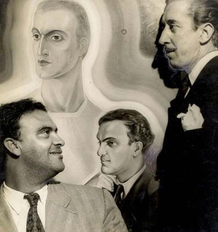 В 40х, Чико Хавьер в сопровождении художника. На заднем плане, картина маслом, представляющая медиума и его Духовного Гида, Эммануэля.