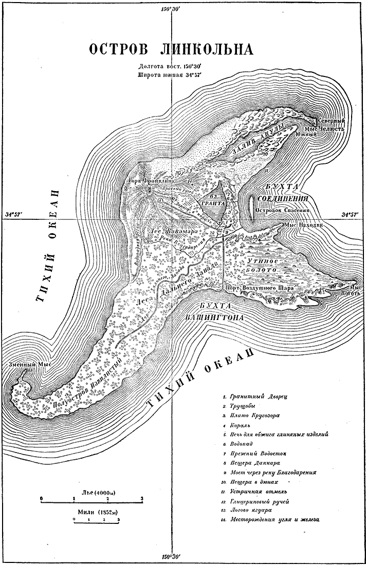 Сайрес Смит сообщил товарищам результат своих выкладок и, учитывая, как и при определении широты, вероятные ошибки в наблюдении, счел возможным заявить, что остров Линкольна лежит между тридцать пятой и тридцать седьмой южной параллелью и между сто пятидесятым и сто пятьдесят пятым меридианом к западу от меридиана Гринвича.