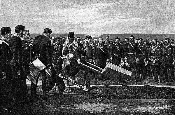 Торжественная закладка Сибирской железной дороги. Иллюстрация из книги «XIX век. Иллюстрированный обзор минувшего столетия» (СПб., 1901. С. 156)